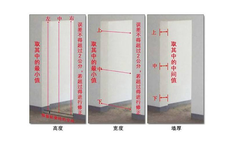 厚度:這里的厚度指的是測(cè)量墻體的厚度,對(duì)墻體厚度水平進(jìn)行測(cè)量,選取5個(gè)以上的測(cè)量點(diǎn),以最大值做為墻體的厚度值,若墻面要裝修的,那么門洞墻體厚度則需附加裝修材料的厚度。