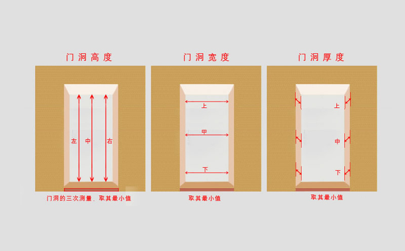 門的尺寸的測(cè)量主要分為中式測(cè)量以及國(guó)際測(cè)量?jī)煞N。中式測(cè)量時(shí)用標(biāo)準(zhǔn)的卷尺去測(cè)量門的寬度(下中上三個(gè)位置點(diǎn))高(左中右三個(gè)位置點(diǎn))然后取這兩個(gè)測(cè)量位置的最小的數(shù)據(jù)值。而國(guó)際測(cè)量的方式是,首先站在距離木門2m遠(yuǎn)的位置觀察,然后用卷尺將門洞左右墻以及頂墻的垂直度、寬度以及高度等等數(shù)據(jù)進(jìn)行測(cè)量,在測(cè)量的時(shí)候還要考慮到地板的厚度問題。